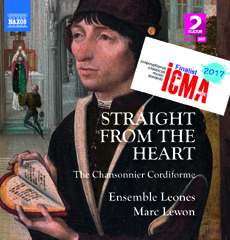 Wir freuen uns außerordentlich, dass die jüngste CD von Ensemble Leones ("Straight from the Heart - The Chansonnier Cordiforme", NAXOS 2016) die nächste Hürde für den ICMA (International Classical Music Award) 2017 genommen hat und jetzt unter den Finalisten der "Shortlist" steht. Das Ergebnis der Sieger wird am 19.1.2017 bekanntgegeben.